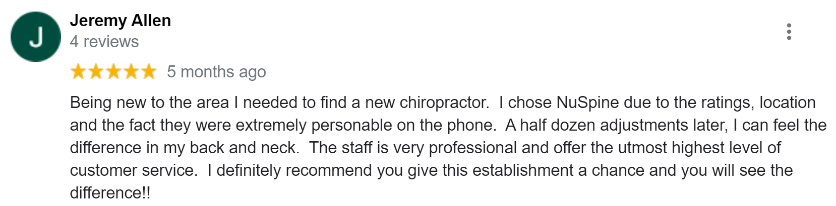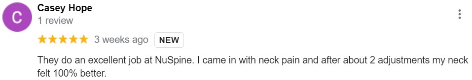 100% Secure. By submitting, you agree to NuSpine Chiropractic's Terms of Use and Privacy Policy. You consent to receive text messages from us at the cell number provided to book your appointment and receive reminders. Message frequency depends on your activity. *New patient offers are valid for TX residents only, and proof of address must be presented upon check-in. Single visits may be purchased for $55, and walk-ins are always welcome.